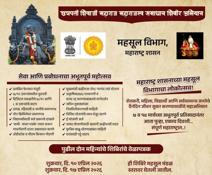 उद्या 10 एप्रिल राजगड येथे छत्रपती शिवाजी महाराज महाराजस्व समाधान शिबिर