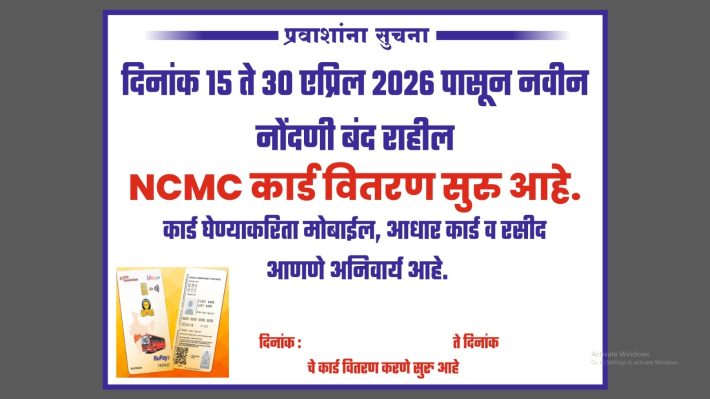 महाराष्ट राज्य परीवहन महामंडळा तर्फे काढल्या गेलेले एनसीएमसी कार्ड चे वितरण करावयाचे असल्यामूळे शासनाकडून प्राप्त सुचने नुसार एनसीएमसी नवीन कार्ड काढणे 30 एप्रिल पर्यंत बंद असून 15 एप्रिल ते 30 एप्रिल पर्यंत आज पर्यंत काढलेल्या कार्ड चे वितरण करण्यात येणार आहे. त्यामूळे ज्यानी एनसीएमसी कार्ड काढले त्यांनी कार्ड घेण्यासाठी एनसीएमसी बसस्थानक मुल या केंन्द्रवर मोबाईल आधार कार्ड व रसीद घेवू उपस्थीत राहणे व आपले कार्ड प्राप्त करून घेणे आवश्यक आहे…..सबब सुचीत करण्यात येत आहे